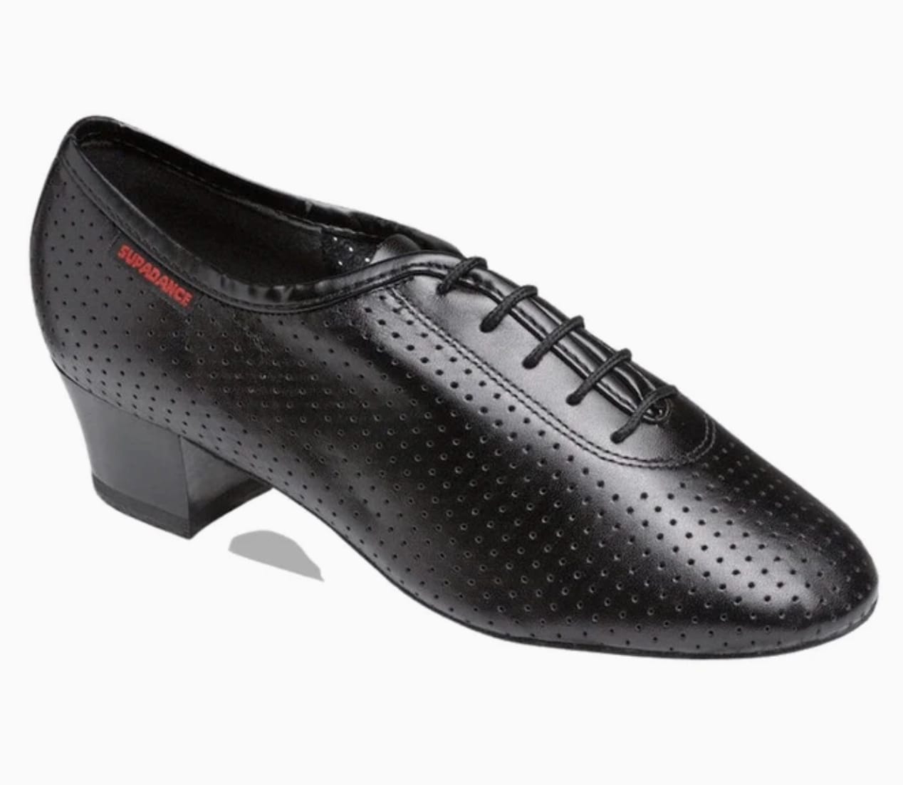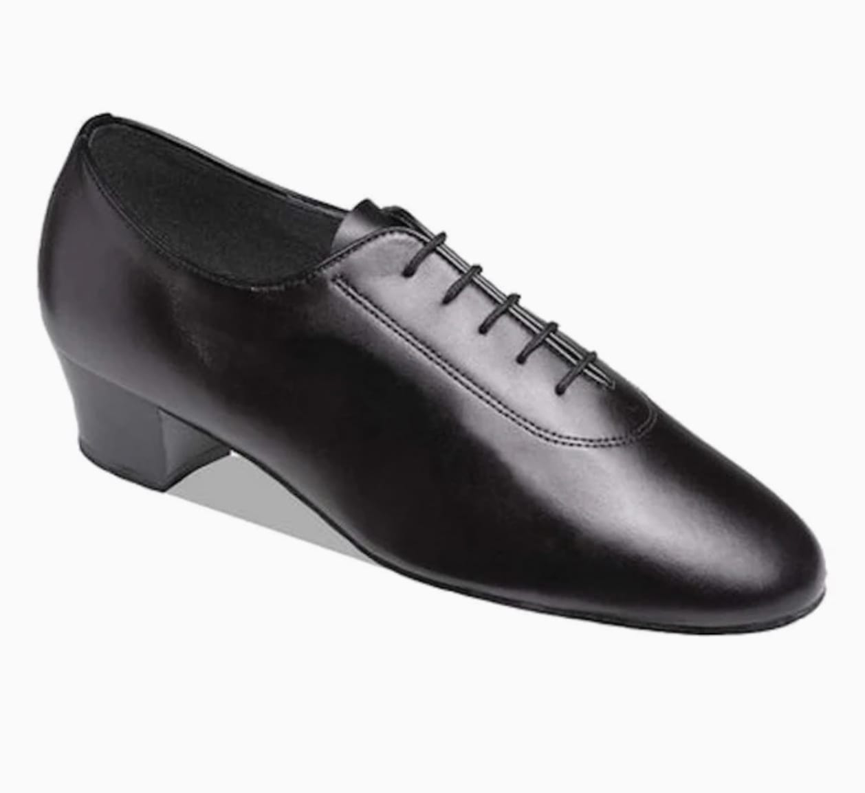 Typically a leather or synthetic upper with a low 1" heel — stable and easy to dance in.